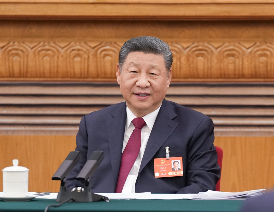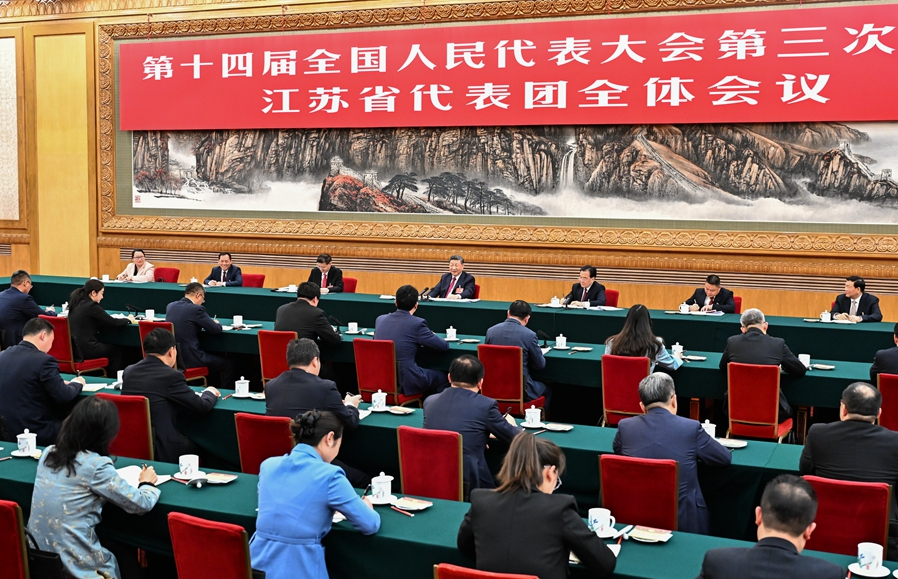3月5日下午,中共中央總書記、國家主席、中央軍委主席習(xí)近平參加他所在的十四屆全國人大三次會議江蘇代表團(tuán)審議。新華社發(fā)(盛佳鵬 攝)
