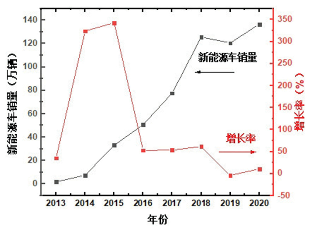 自2013年以來,我國新能源汽車銷量呈現(xiàn)逐年增加趨勢,但增長率變化較大。2014年、2015年受新能源補貼影響,增長率維持在300%左右;受新能源騙補調(diào)查、補貼退坡影響以及準入門檻提升之后,至2018年保持在50%左右;2019年新能源汽車進一步退坡,首次出現(xiàn)新能源汽車年度銷量下滑。至此,新能源汽車逐漸由政策驅(qū)動向市場驅(qū)動轉變。2020年我國新能源汽車銷售136萬輛,純電動汽車111萬輛,插電混動汽車25萬輛,燃料電池汽車1000輛。2021年1~10月,新能源汽車銷售254萬輛,其中純電動汽車210萬輛,插電式混合動力汽車43.7萬輛,燃料電池汽車953輛。
