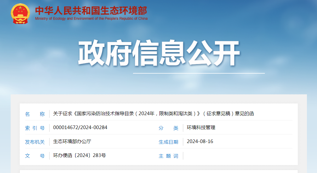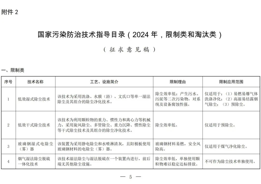 生態環境部發布《國家污染防治技術指導目錄(2024年,限制類和淘汰類)》(征求意見稿)