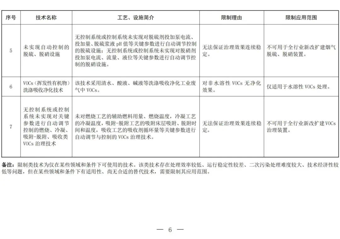 限制類技術為僅在某些領域和條件下可使用的技術。該類技術存在處理效率較低、運行穩定性較差、二次污染處理難度較大、技術經濟性較低等問題,但在某些領域和條件下有適用性、尚無合適的替代技術,需要限制其應用范圍。