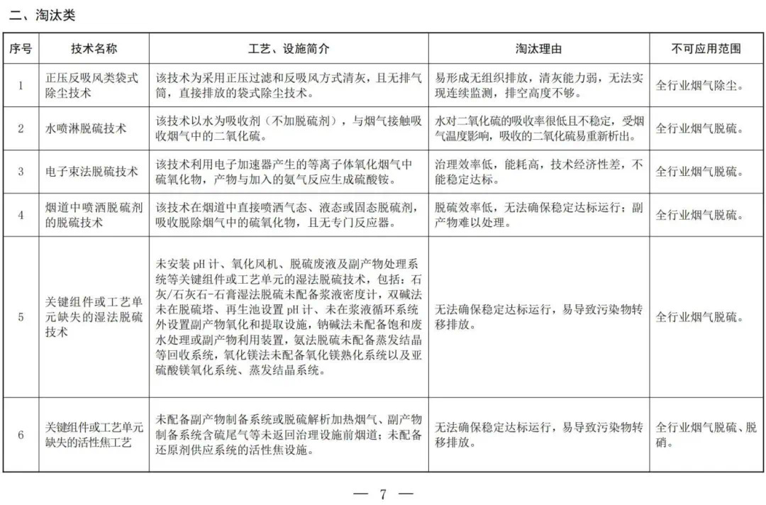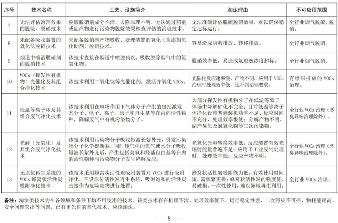 淘汰類技術為在各領域和條件下均不可使用的技術。該類技術存在機理不清、處理效率低下、運行穩定性差、二次污染不可控、 物耗能耗高、安全問題突出等問題,已有更先進的替代技術,應該淘汰。