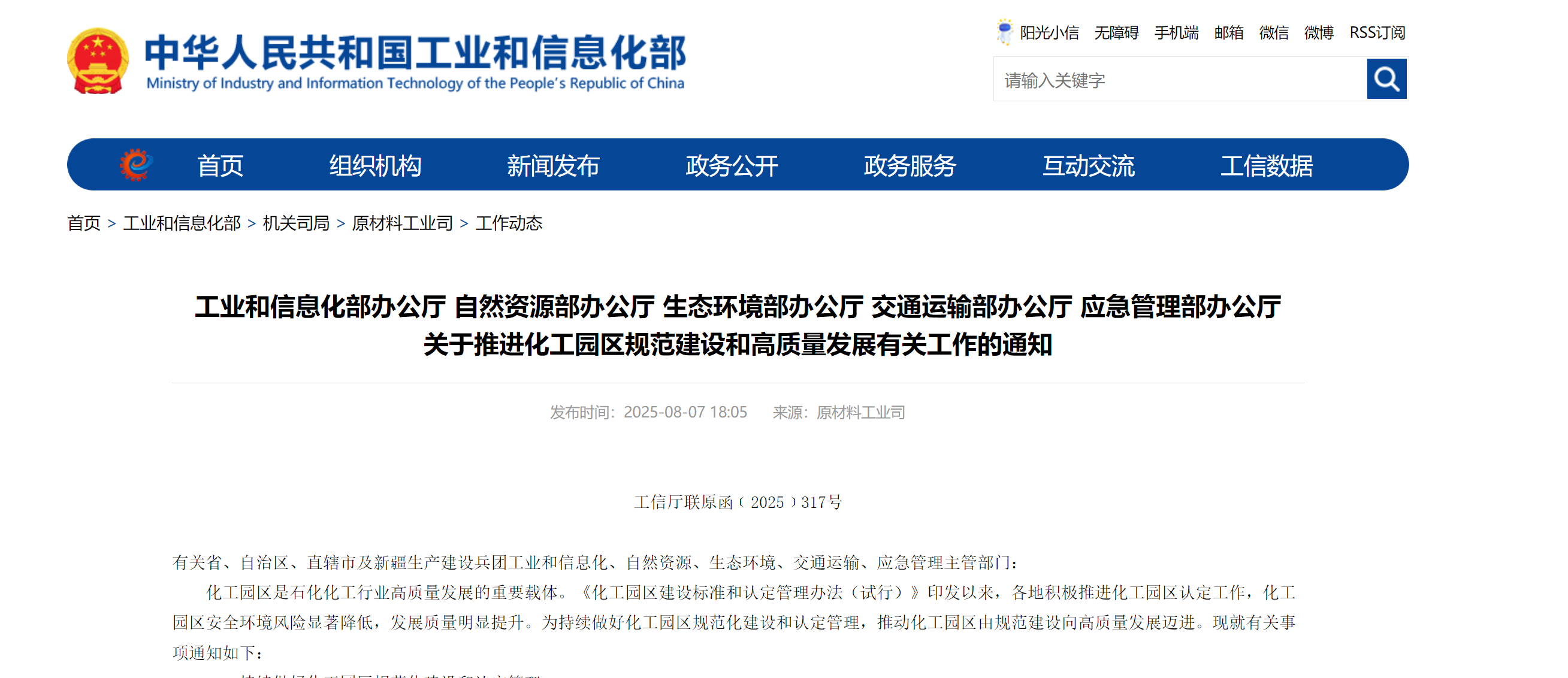 工信部等五部門聯(lián)合印發(fā)《關(guān)于推進(jìn)化工園區(qū)規(guī)范建設(shè)和高質(zhì)量發(fā)展有關(guān)工作的通知》