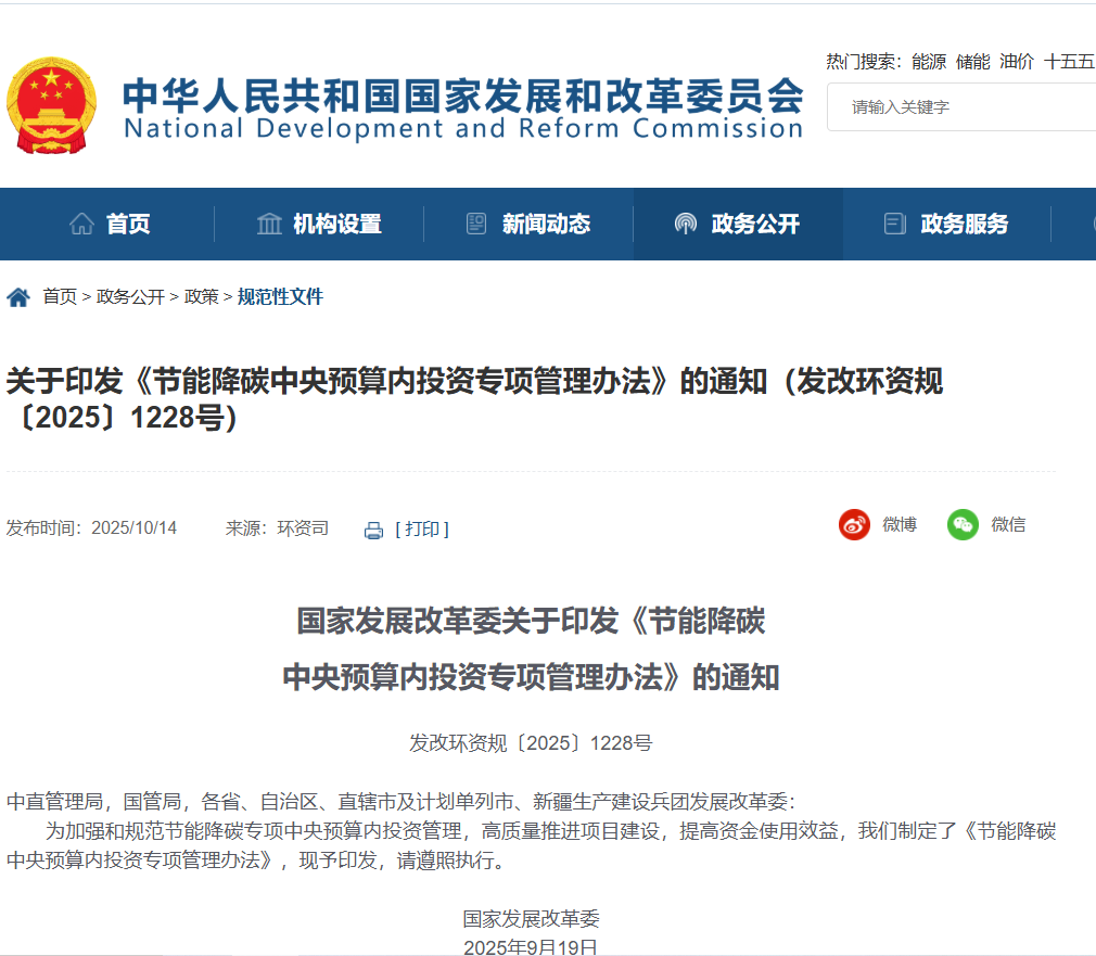 國(guó)家發(fā)展改革委關(guān)于印發(fā)《節(jié)能降碳中央預(yù)算內(nèi)投資專項(xiàng)管理辦法》的通知