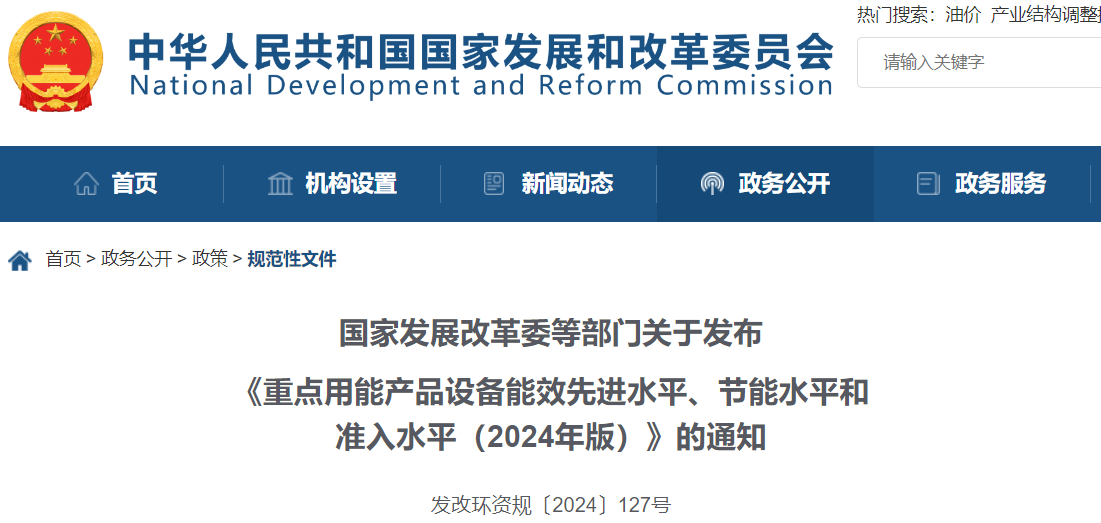 國家發改委等部門關于發布《重點用能產品設備能效先進水平、節能水平和準入水平(2024年版)》的通知