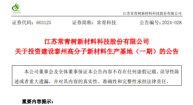 5月15日晚間,常青科技發布關于投資建設泰州高分子新材料生產基地(一期)的公告。