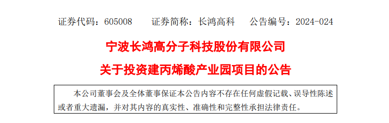 長鴻高科4月29日晚間公告,公司擬在廣東省茂名市濱海新區投資建設新項目“丙烯酸產業園項目”,項目總投資約115億元。長鴻高科稱,該項目將顛覆性地以丙烷為原料直接氧化生產中間產品丙烯酸,再采用酯化、聚合工藝生產高附加值的丙烯酸酯及SAP產品,符合新質生產力的發展要求。