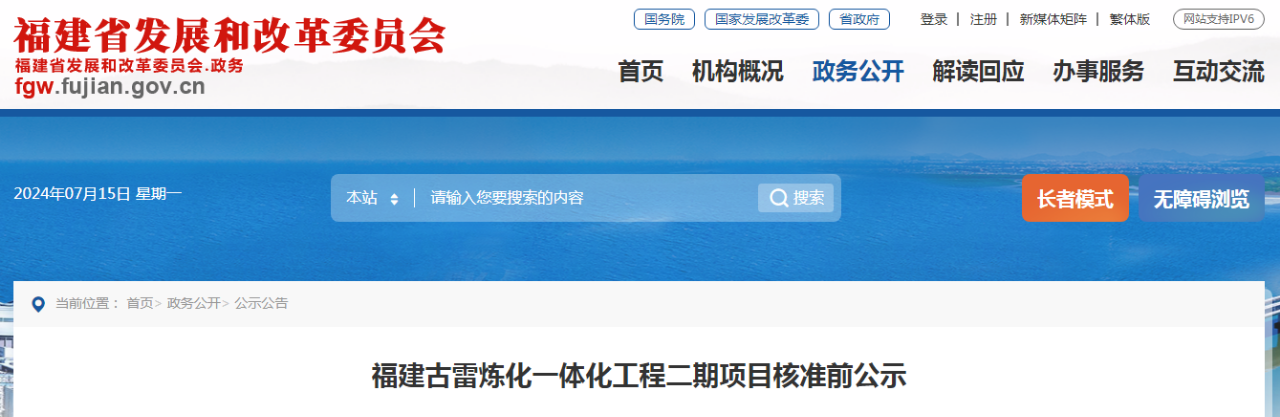近日,福建省發改委網站發布公告,對福建古雷煉化一體化工程二期項目核準前公示。公告顯示,根據《福建省企業投資項目核準和備案管理實施辦法》(閩政〔2017〕45號)等有關規定,福建省發改委擬對福建古雷煉化一體化工程二期項目進行核準,項目已列入相關規劃,現將項目進行核準前公示。