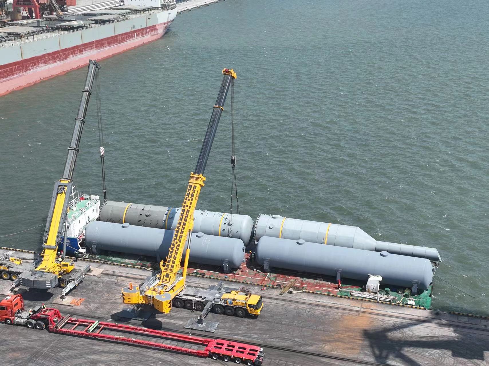 空分裝置長(zhǎng)周期設(shè)備從2023年7月開始制作,經(jīng)過一年的制作周期,空冷塔、水冷塔、兩臺(tái)分子篩純化器共四臺(tái)大型設(shè)備首批進(jìn)場(chǎng)安裝,各設(shè)備直徑約5米、高度約30米,單體重量介于70-120噸之間。設(shè)備由江蘇南通出發(fā),克服海上大風(fēng)、風(fēng)暴潮等惡劣天氣影響,經(jīng)過多日的海上“漂泊”順利抵達(dá)盤錦港,是項(xiàng)目到貨安裝的首批大型設(shè)備。