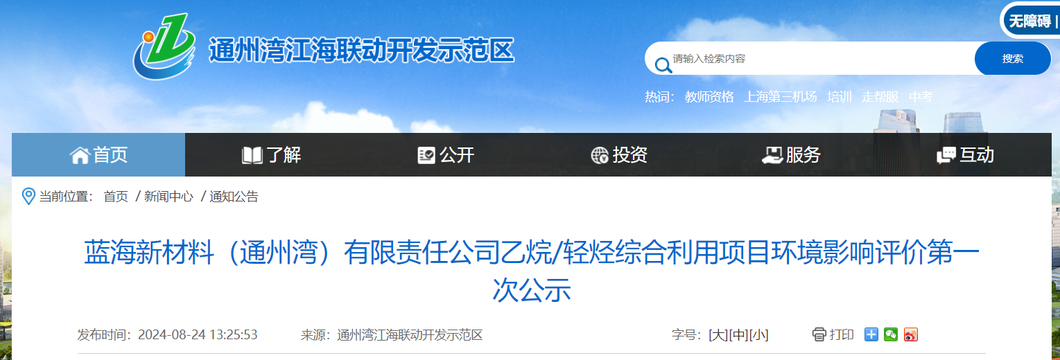 8月24日,藍海新材料(通州灣)有限責任公司乙烷/輕烴綜合利用項目環境影響評價第一次公示。